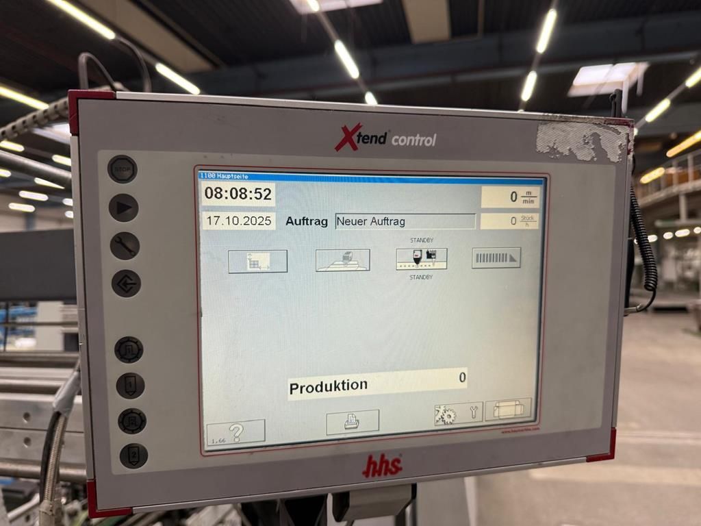 Equipment: straight line, lock bottom, double wall, 4 point gluing, electronic upper gluing system HHS X-tend, 8 channels with 4 guns, high pressure, lower disc gluing system left, feeder with vacuum and vibrator, aligning station right and left, pre breaker left, kicker, counter, digital read out units, additional module for lock bottom and 4 corner, motorized upper and lower middle transport in folding, press rolls after folding, electronic back folding servo system with touch-screen, camera control in trombone station, squaring station at press station, extended, pneumatic press station.