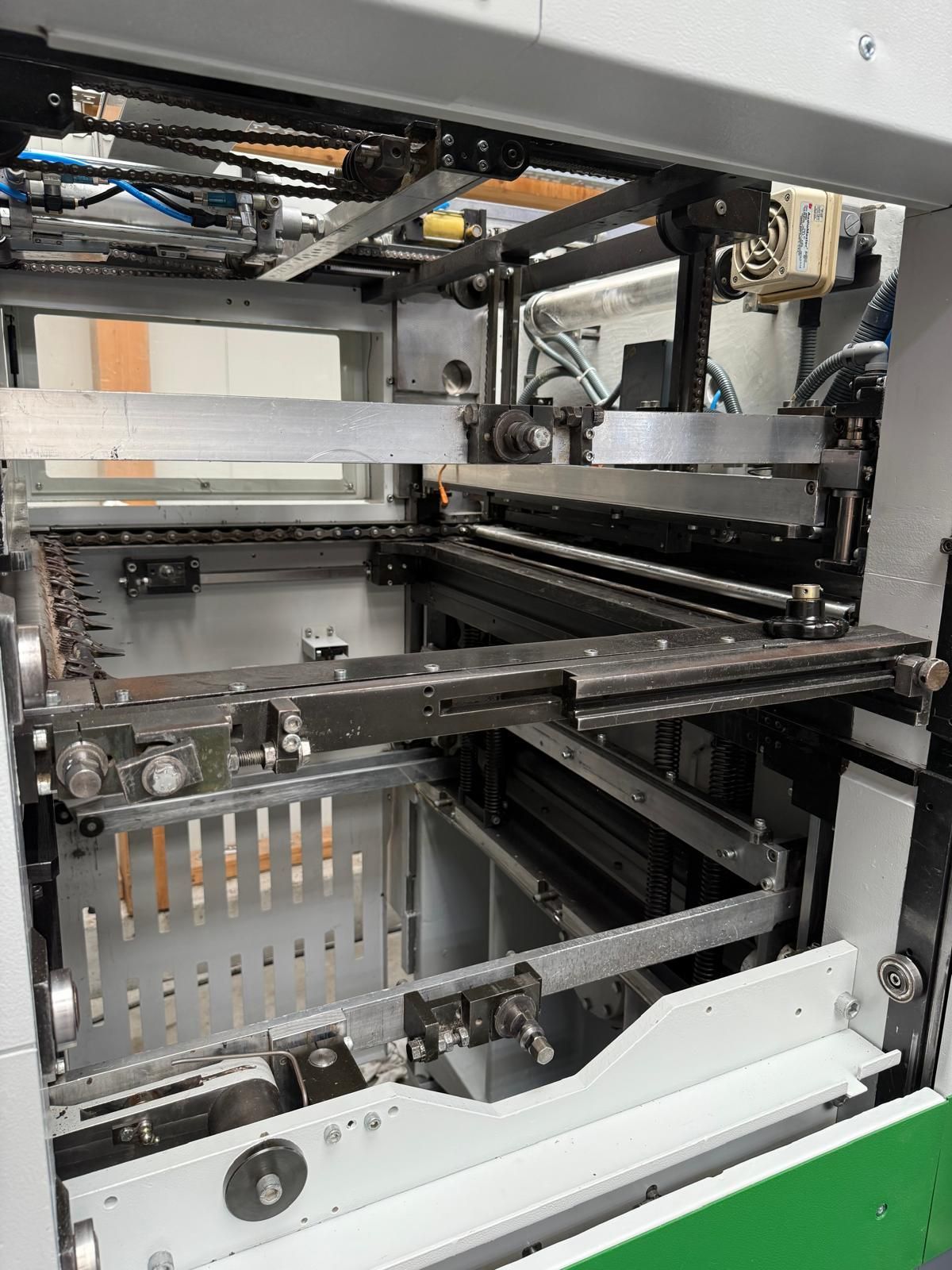 Equipment: Stripping station, centerline, non-stop feeder, non-stop delivery with apron, pull mark left, push mark right, gripper edge separation, 41cm elevated, production hours: 25.000, Bobst-Cube control, micrometer adjustment, electric double sheet control,1 upper die cutting frame,1 die cutting plate 4 mm,1 upper stripping frame,1 lower stripping frame, max. machine speed 7000 sheets/hour, max. pressure 250 tons, processable materials: paper min. 80g/m², cardboard up to max. 2000g/m², corrugated cardboard up to 4mm.